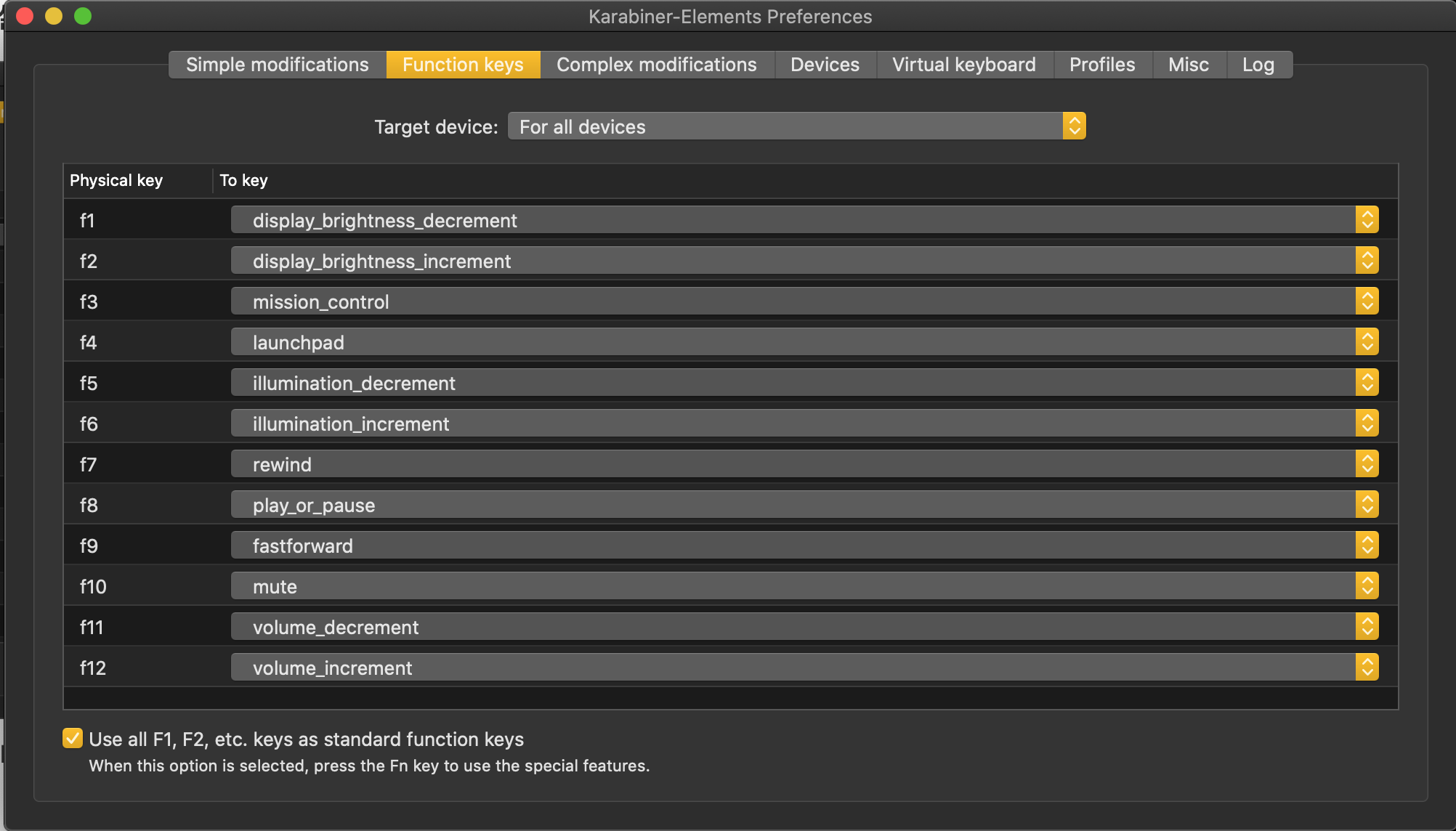 Function keys 탭으로 넘어가 하단에 있는 Use all F1, F2, etc. keys as standard function keys 에 반드시 체크해주자. 이게 안되어 있으면 딜레이 제거가 되지 않는다.
